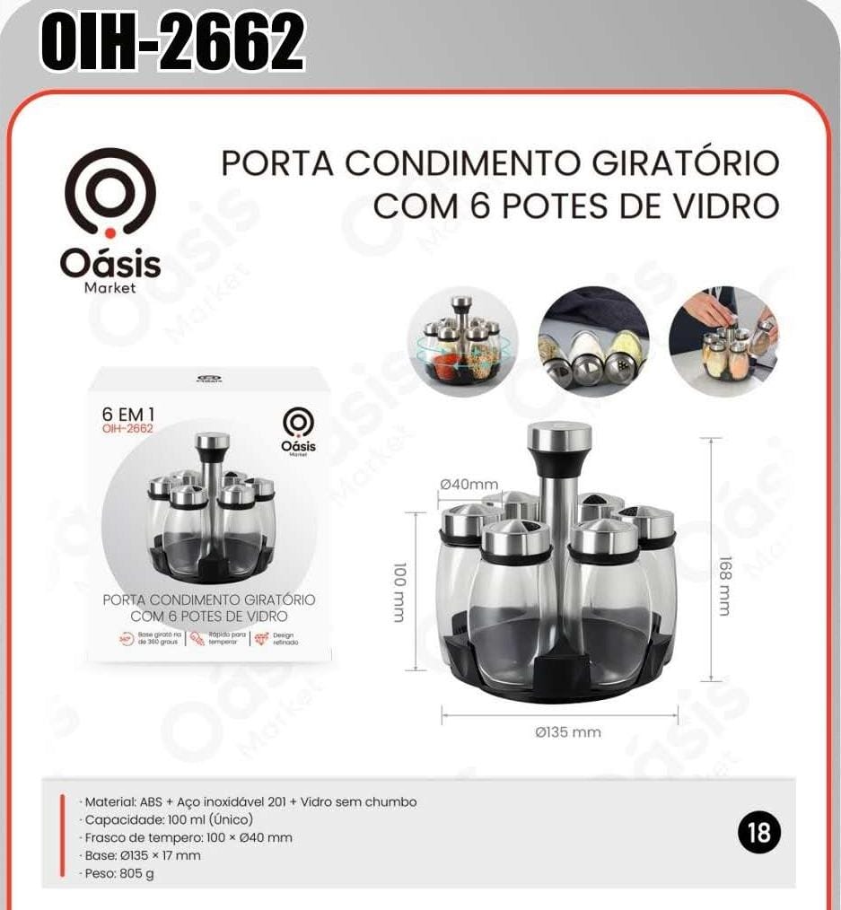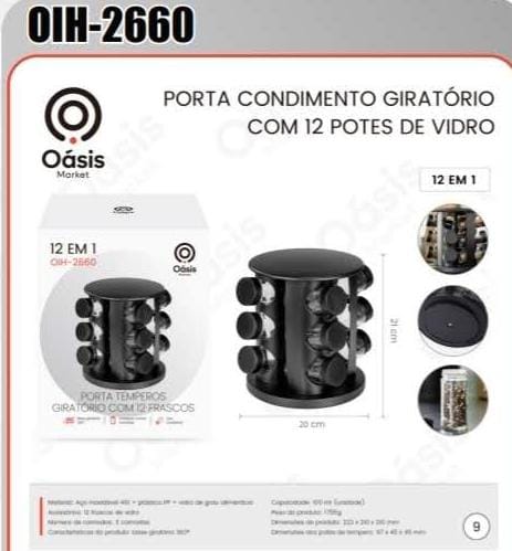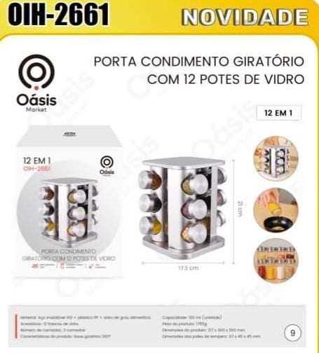 PORTA TEMPEROS GIRATÓRIO COM 12 FRASCOS INOX OIH2661